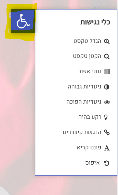 בלחיצה על הכפתור הנגישות הכחול ייפתח תפריט נגישות עם כלי עזר שונים כפי שמצויין בתמונה: